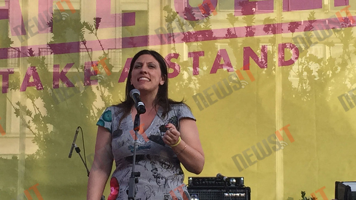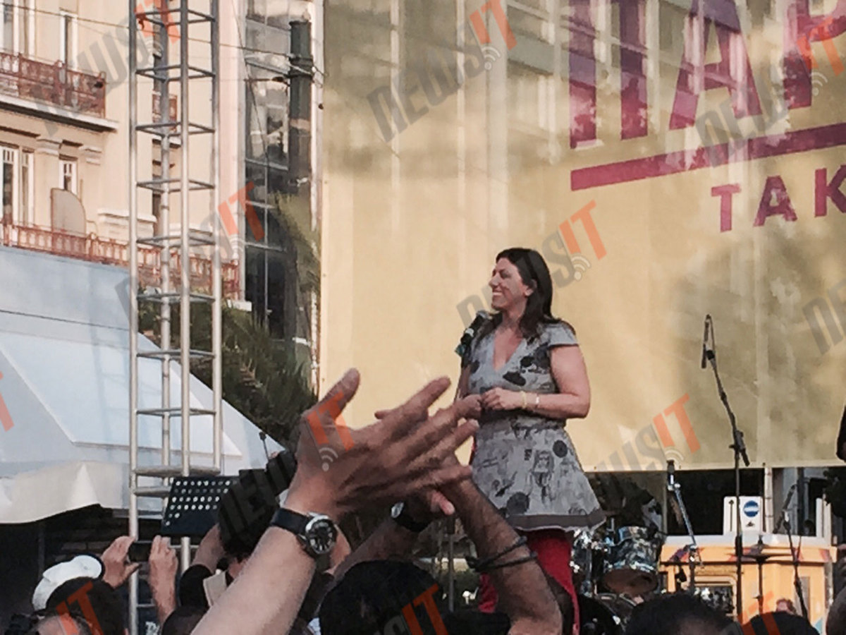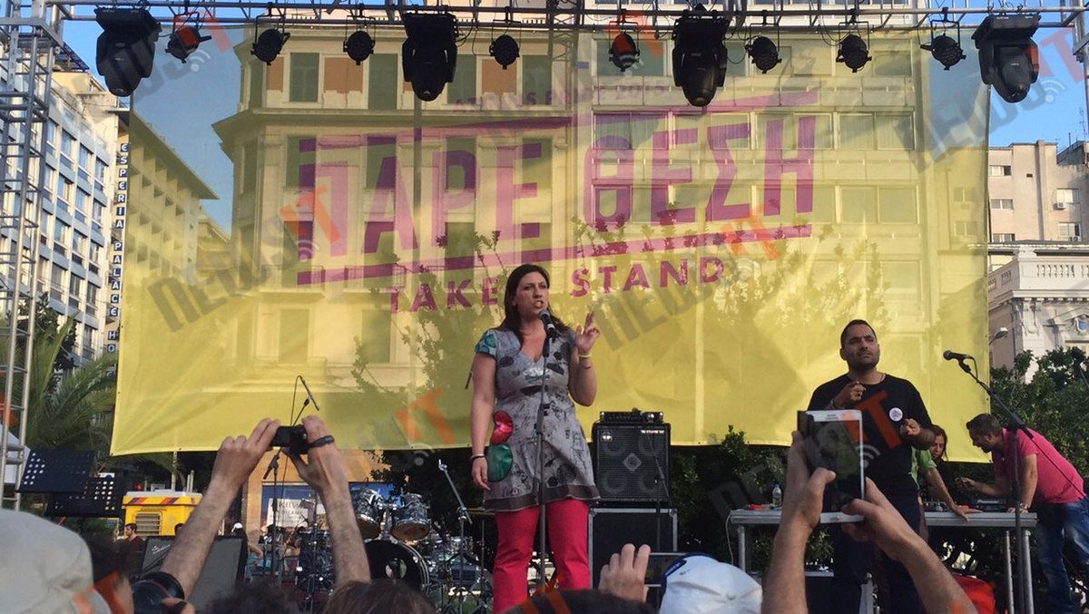 Με ένα φούξια παντελόνι και ένα γκρι μπλουζάκι με γράμματα, σχέδια και χρώματα, η Ζωή Κωνσταντοπούλου κέρδισε το χειροκρότημα και την αποθέωση από τους παρευρισκόμενους όταν ανέβηκε στη σκηνή και μίλησε για τους αγώνες των γκέι.
