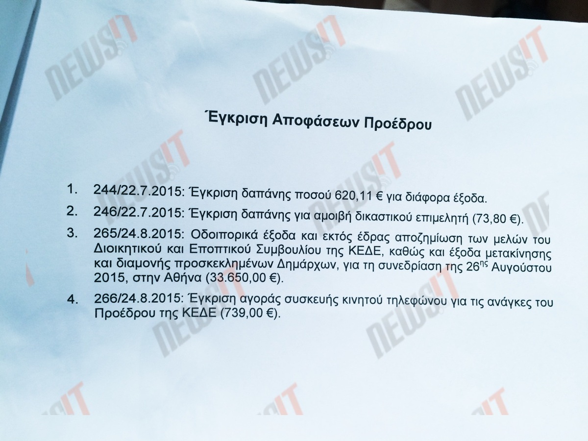 Φαίνεται, όμως, πως δεν είναι μόνο τα κινητά που κοστίζουν πολύ, καθώς στις αποφάσεις του Προέδρου εγκρίνονται επίσης “Οδοιπορικά έξοδα και εκτός έδρας αποζημίωση των μελών του Διοικητικού και Εποπτικού Συμβουλίου της ΚΕΔΕ, καθώς και έξοδα μετακίνησης και διαμονής προσκεκλημένων Δημάρχων, για τη συνεδρίαση της 26ης Αυγούστου 2015 στην Αθήνα (33.650 ευρώ)”.